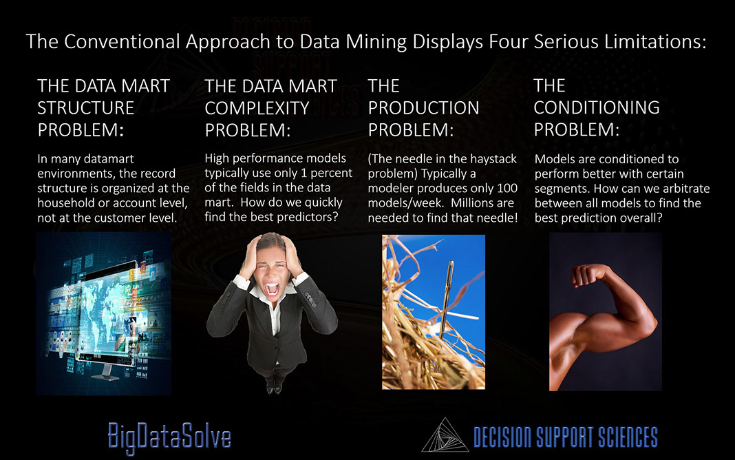 Ultra-High Performance Data Mining (UHP-DM)™ takes predictive analytics to a new level. And BigDataSolve™ is the core enabling technology that undergirds it. It takes on the four key limitations that prevent data mining from producing breakout results.