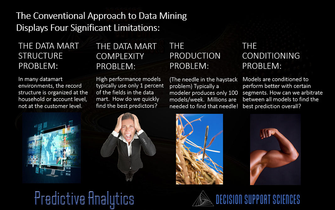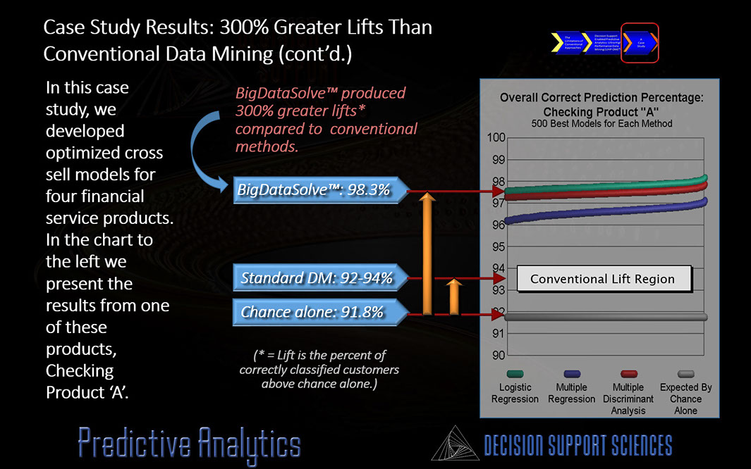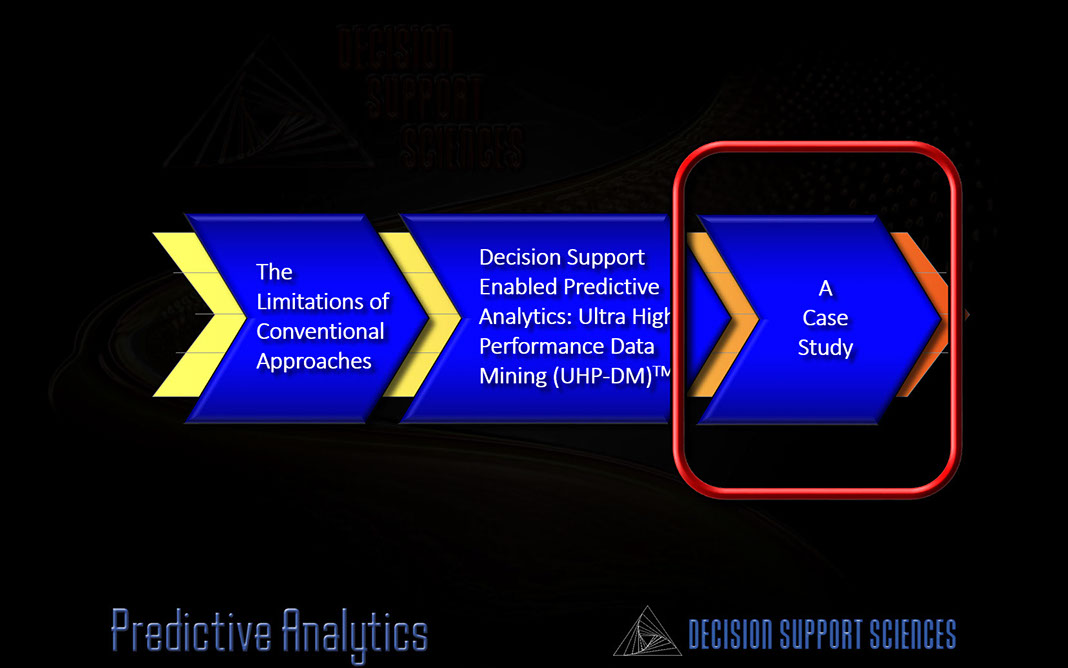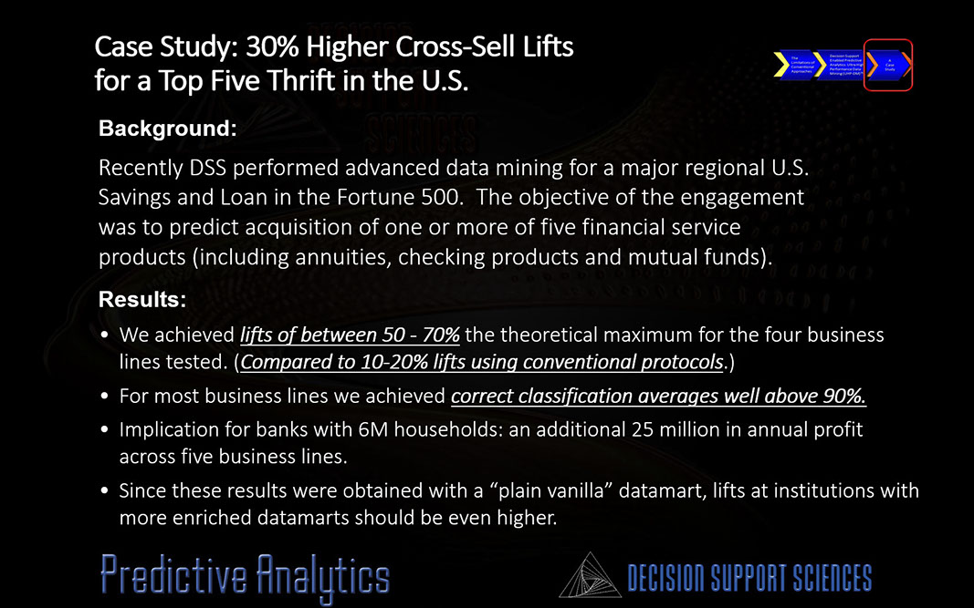 Here is a case study performed for one of the top five regional banks in the country. What happens when you solve the Data Structure Problem, the Data Complexity Problem, the Needle in the Haystack problem, and the Conditioning Problem all at once? You produce 300% higher lifts than conventional data mining. Welcome to decision support enablement!
