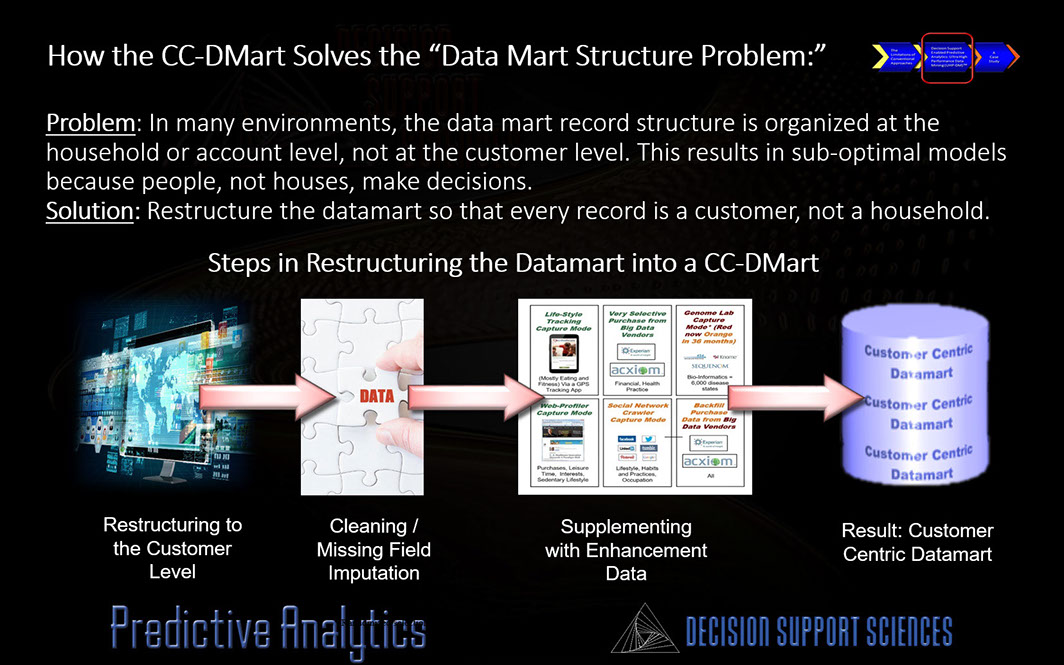 To produce the highest results (lifts) your data needs to be optimally structured. But how do you do that without shelling out big bucks to a data integrator? It's simple. Keep your production mart.... and build a customer centric modeling mart (CC-Dmart) alongside it!