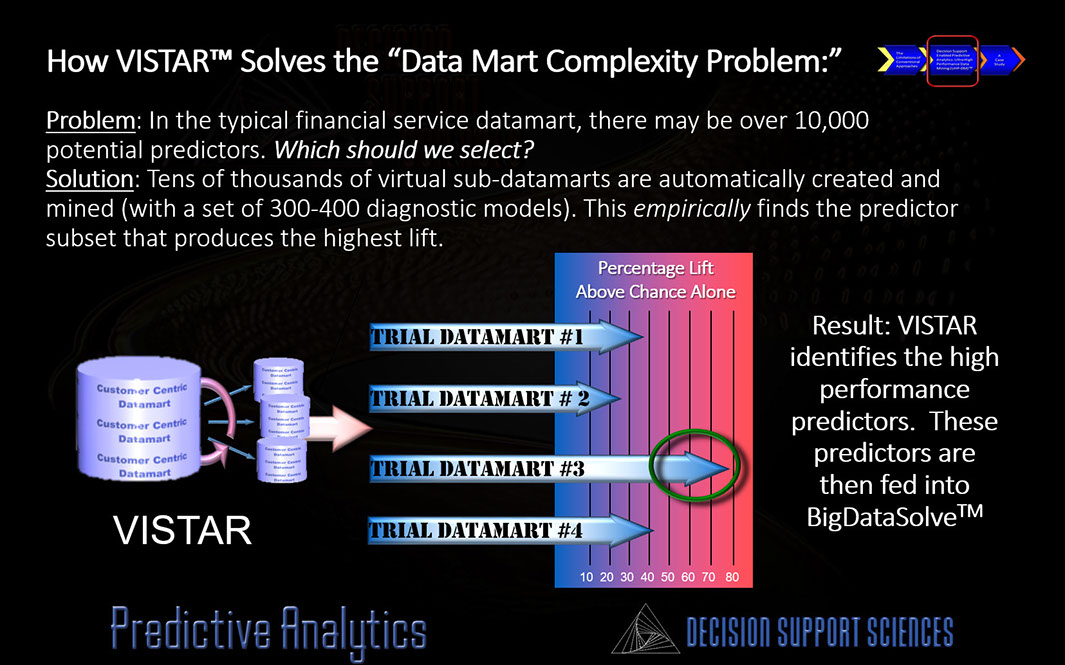 To produce the highest results (lifts) you need to find the best predictors. After all, "garbage in...garbage out." This, of course, begs the larger question, namely, is there a more productive way to find the best predictors? There is...and we call it VISTARTM. VISTARTM stands for Virtual Subdatamart Testing and Reduction. VISTARTM fires up the rapid modeling mart and convergently tests a) which predictors and in b) which combinations will produce the highest performing results.