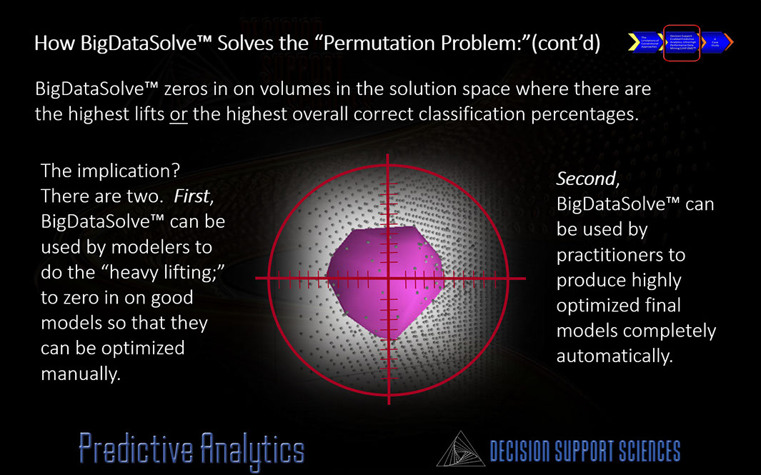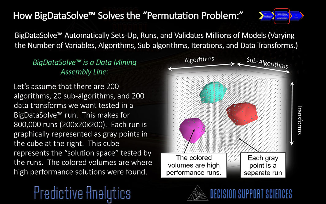To produce the highest results (lifts) you need to find the optimal model that "sees" your data best. This begs another question! Is there a more productive way to find the needle in the haystack (the best algorithm, transforms. sub-algorithm. etc.)? You bet there is...and its called BigDataSolve™. BigDataSolve™ plays with "all the knobs" automatically...so you don't need to! In so doing BigDataSolve™ creates a solution space and converges on the optimal model and model form. Automated predictive analytics has arrived.