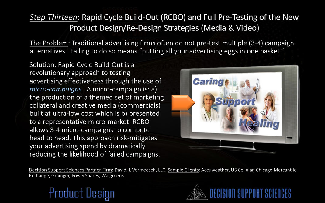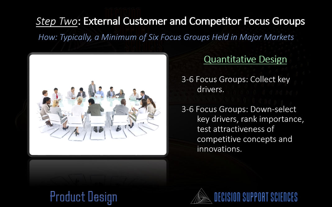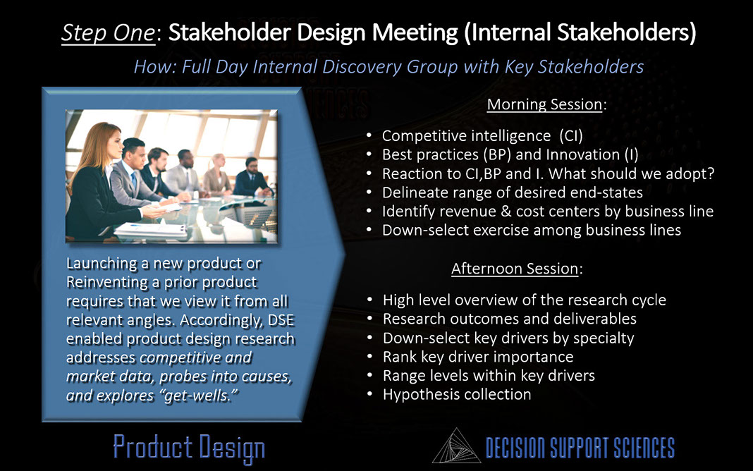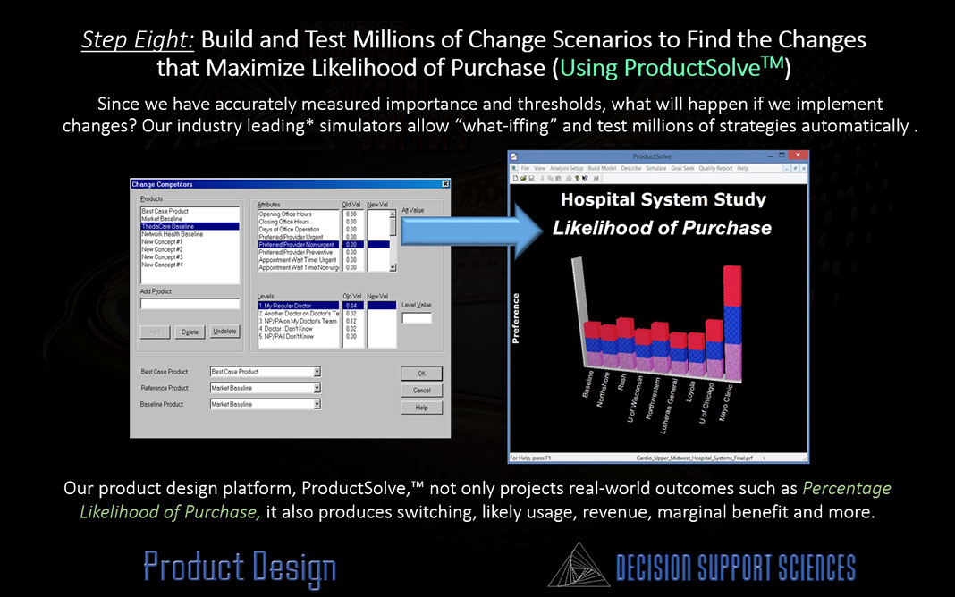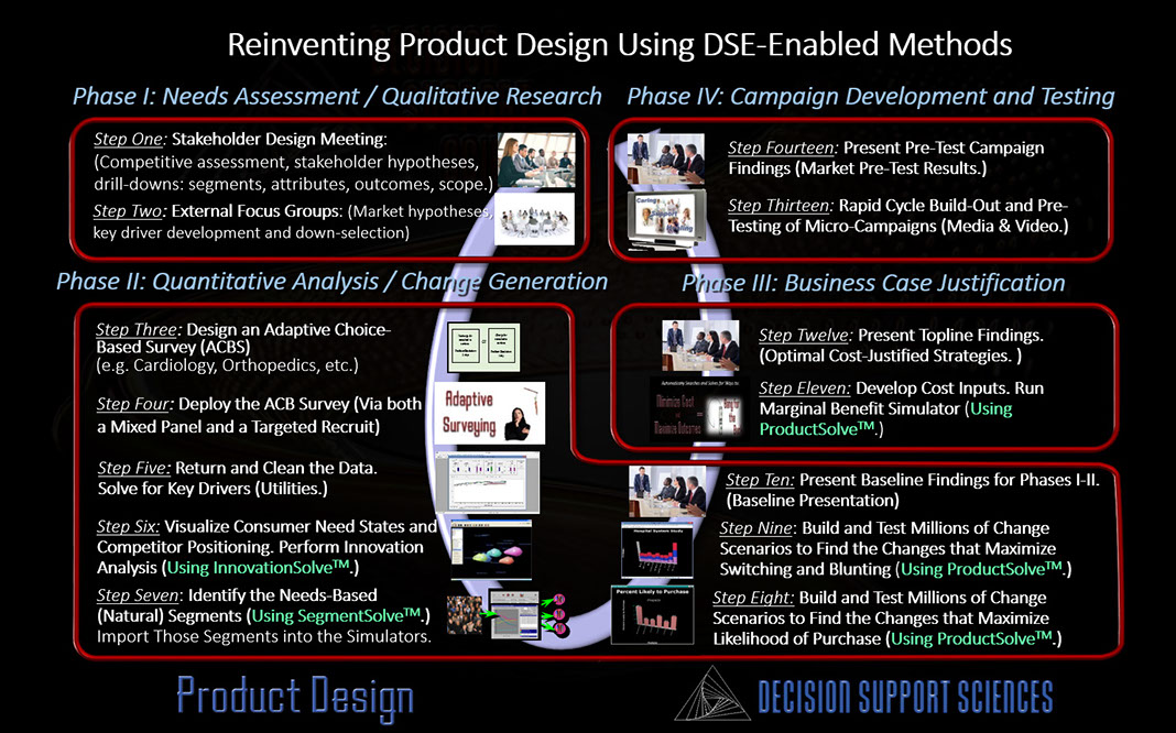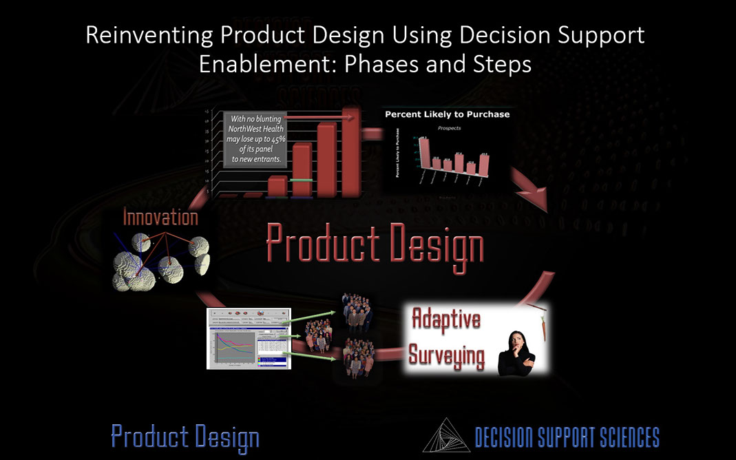 Decision Support-Enabled Product Design markedly outperforms conventional product design protocols. This differentiation is due to five key distinctives: 1) DSEPD uses a specialized survey design that obtains seven key categories of data 2) DSEPD calculates from that survey ultra accurate importance scores (utilities) for each respondent (see benefit three) 3) DSEPD obtains key behavioral thresholds that determine how much summed preference are required to get each individual respondent "off the dime" 4) DSEPD leverages an advanced analysis system that finds all significant differences in importance, performance and expectation 5) DSEPD uses goal solving simulators that yield real-world outcomes (RWO's).