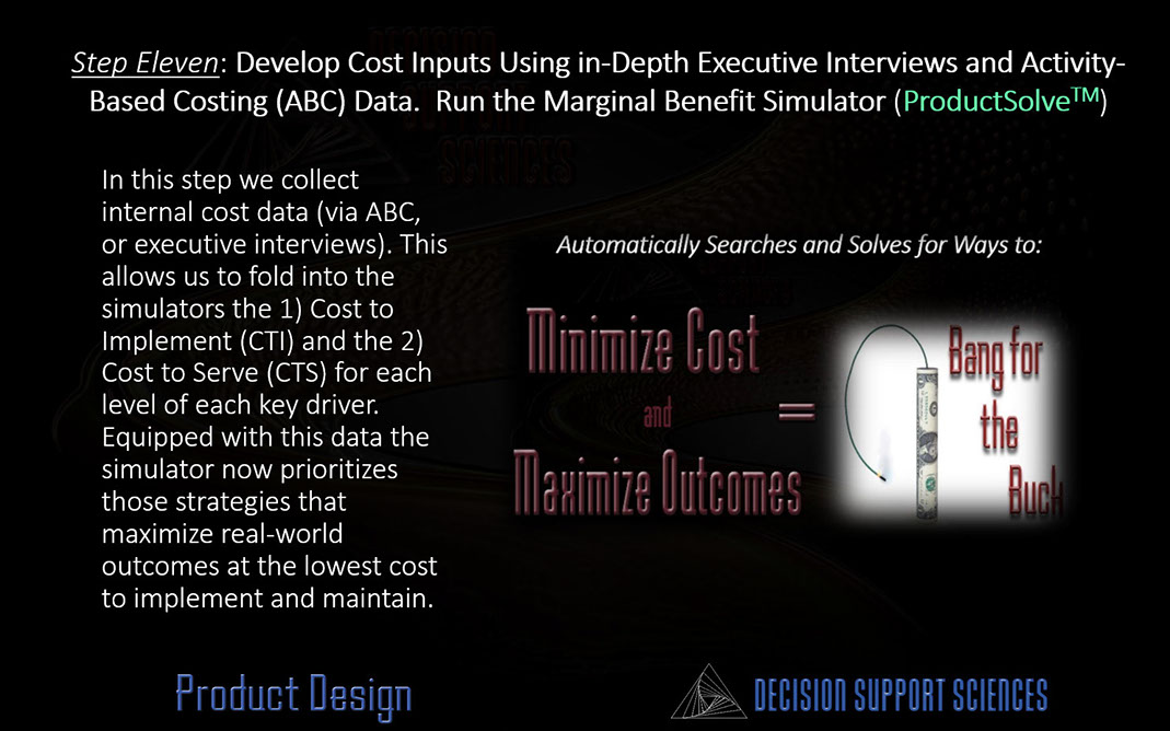 One of most powerful capabilities build into our Product Design protocol is the ability to perform Marginal Benefit (MB) Modeling. The MB model combines a real world outcome model (e.g. new customer capture, likelihood of purchase, switching, retention, etc) with two types of cost data, cost to implement (CTI) and cost to serve (CTS) data. By using CTI and CTS, the Marginal Benefit Model finds strategies that maximize real world outcomes at the lowest cost. The MB model, quite literally, searches and solves for the changes to your product or service that will yield the maximal "bang for the buck."