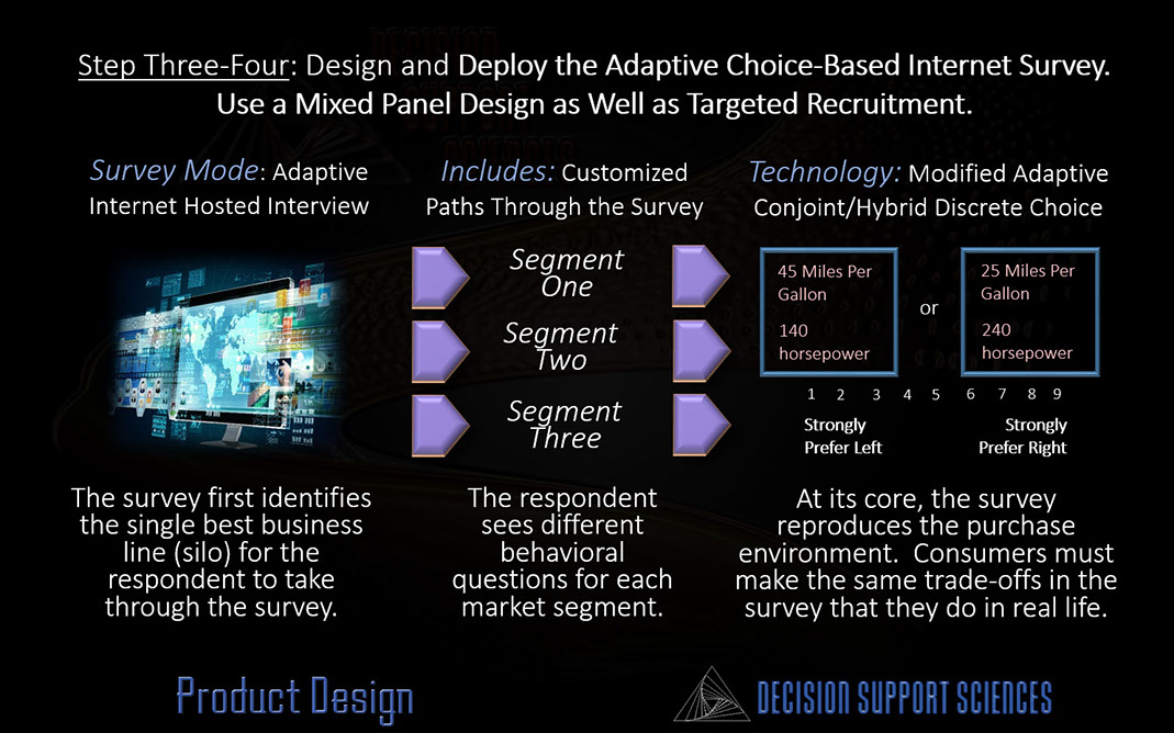 Another primary reasons why our Product Design protocol outperforms other protocols relates directly to our adaptive survey system. Our adaptive surveying approach: 1) eliminates irrelevant attributes for each respondent 2) reproduces the real-world purchase environment 3) requires the respondent to make the same product feature trade-offs in the survey that they must make in real life 4) adapts in real time to prior choices to zero-in on that particular consumer's most critical values and it 5) discovers "how much" preference (summed importance) it takes to meet real-world thresholds (e.g. switching, purchase, etc.)
