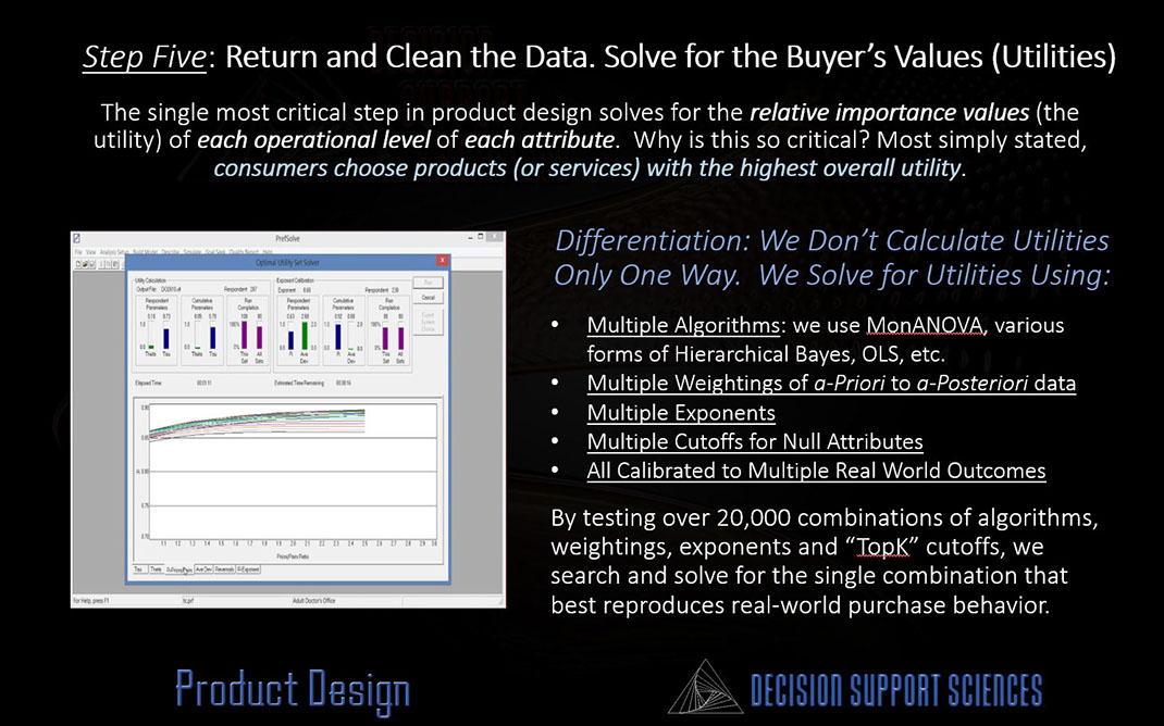 One of the central reasons why our product design protocol outperforms other approaches relates to our product design decisioning platform, ProductSolve™. In contrast to other systems, ProductSolve™ does not use a "canned method" to calculate its utilities. ProductSolve™, in fact, tests over 20,000 distinct combinations of algorithms, weightings, exponents and "TopK" cutoffs. Although this process is computationally intensive, it guarantees that ProductSolve™ empirically converges upon the utility set that best reproduces real-world purchase behavior.