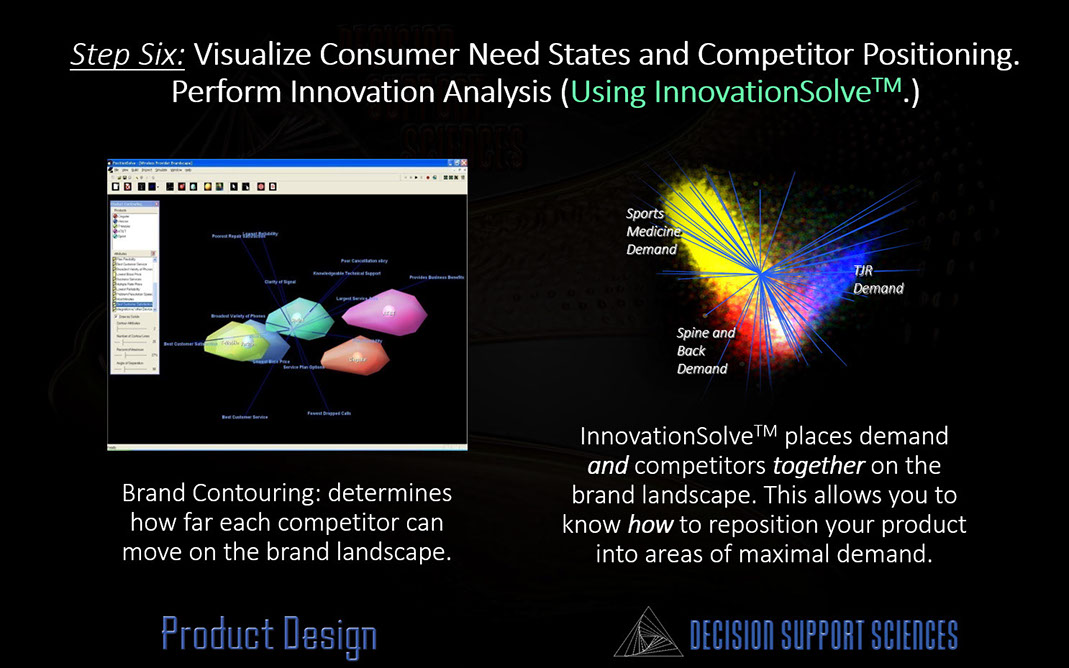 Unlike other approaches to product design, we don't rely on utility-based simulation models alone to risk-mitigate change. We use another complementary approach, as well, multivariate data reduction via InnovationSolve™. InnovationSolve™ accurately locates both brands and demand on the same landscape, a concept so insightful that it earned a main stage presentation at AMA's prestigious Annual Advanced Research Technique forum. Why? Simple! Demand is the missing link in most strategy systems. Demand (seen here as semi-transparent spheres) identifies where to build new products and HOW to message that innovation.