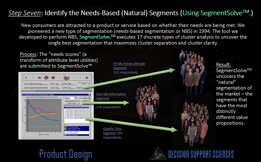Most marketers are aware that, quite frequently, the entire profit model from a product or service may arise from only one or two market segments. Accordingly, the decision support platform for Product Design, ProductSolve™ has the capability to automatically set up and scan for 1) significant analytical findings (e.g. importance, performance, expectation, etc.) and 2) optimal products across hundreds or thousands of market segments. The latter capability can be combined with goal-solving to automatically search and solve for product configurations within segments of customers that will produce optimal real world outcomes (RWO) for your product or service.