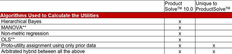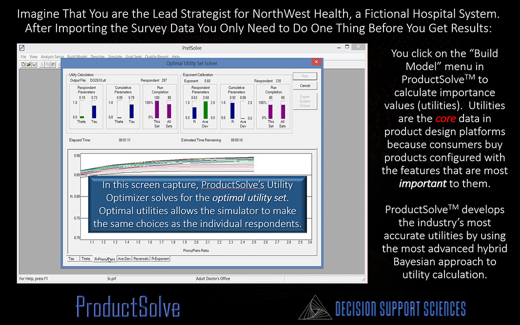 One of the truisms of decision-support systems is that it can only be as accurate as the respondent-level utilities that undergird it. One of the central reasons why ProductSolve™ is so accurate is that we don't used a "canned method" to calculate the utilities. In fact, we search and solve for the optimal market level utility set by testing over 20,000 combinations of algorithms, weightings, exponents and "TopK" cutoffs. This guarantees that we empirically converge upon the utility set that best reproduces real-world outcomes (RWO's) such as sales, new customer capture, switching, etc.