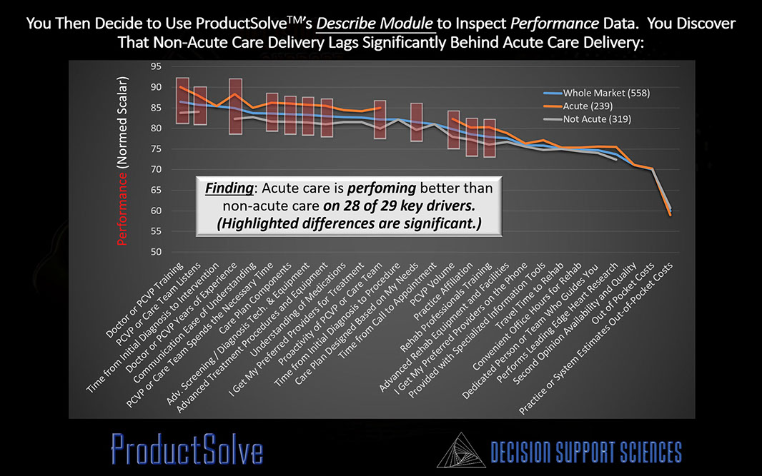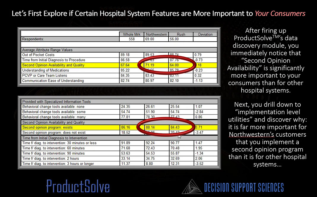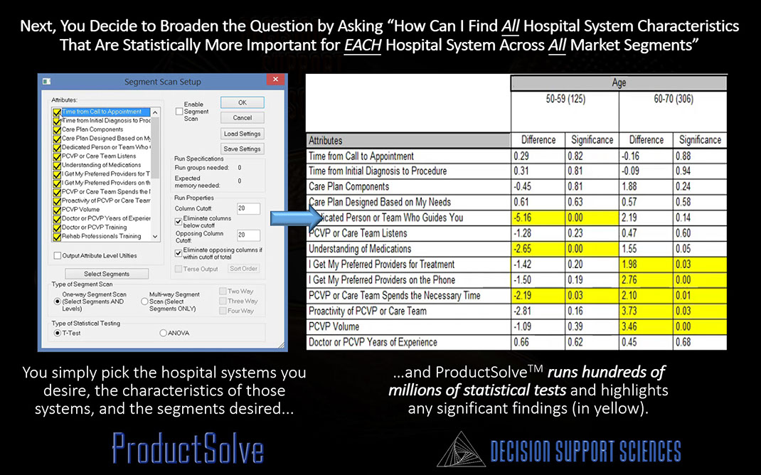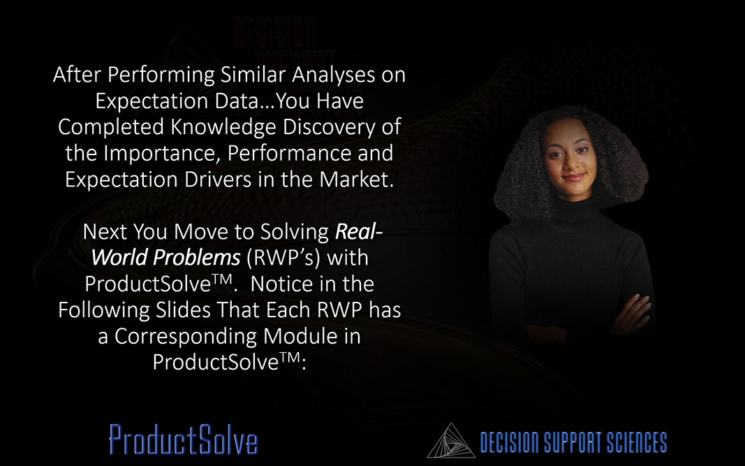Most marketers are aware that, not infrequently, the entire profit model from a product or service may arise from only one or two market segments. Accordingly ProductSolve™ has the capability to automatically set up and scan for 1) significant analytical findings (e.g. importance, performance, expectation, etc.) and 2) optimal products across hundreds or thousands of market segments. The latter capability can be combined with goal-solving to automatically search and solve for product configurations within segments of customers that will produce optimal real world outcomes (RWO) for your product or service.