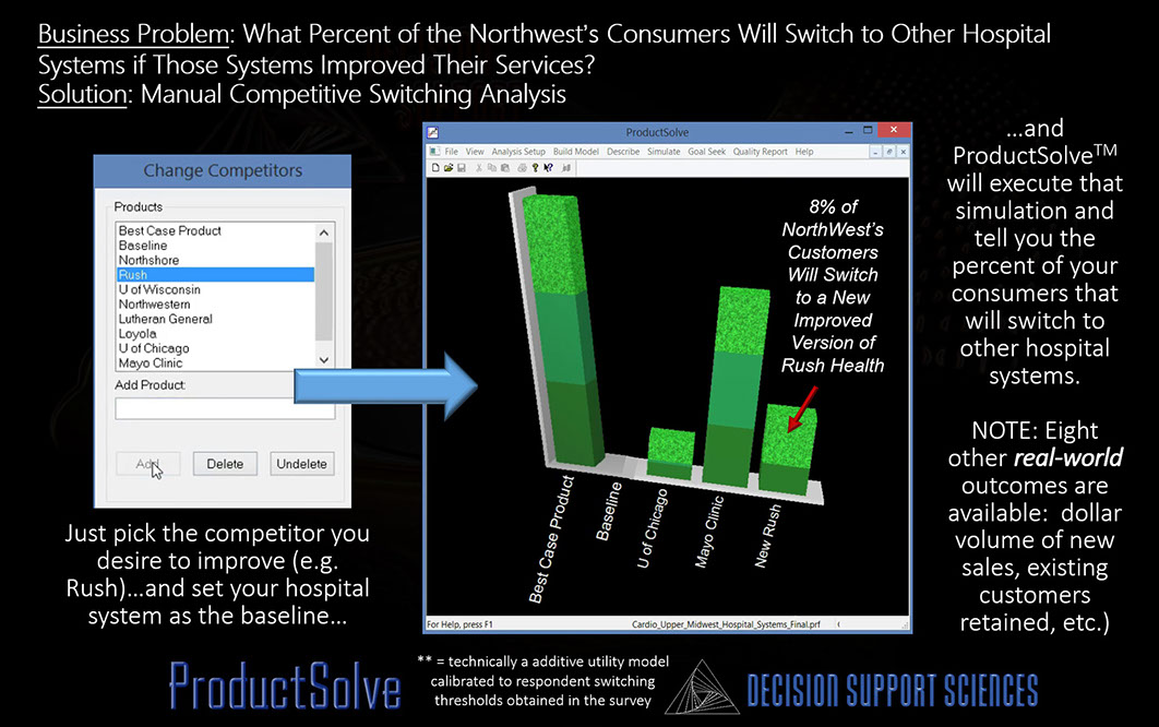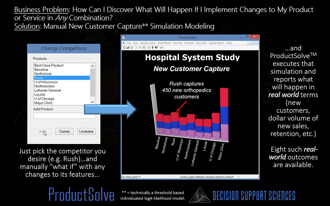 It has never been enough to just guess at an outcome.! Nonetheless, many simulation-based approaches only allow manual "what-iffing." In contrast, truly thorough risk-mitigation requires goal-solving. The goal solving built into ProductSolve™ is called Multi-Attribute Simulation Scanning or MASS. MASS automatically builds and tests millions of products to find the subset that produces critical real world outcomes (RWO's) such as maximal new customer capture, switching, etc.