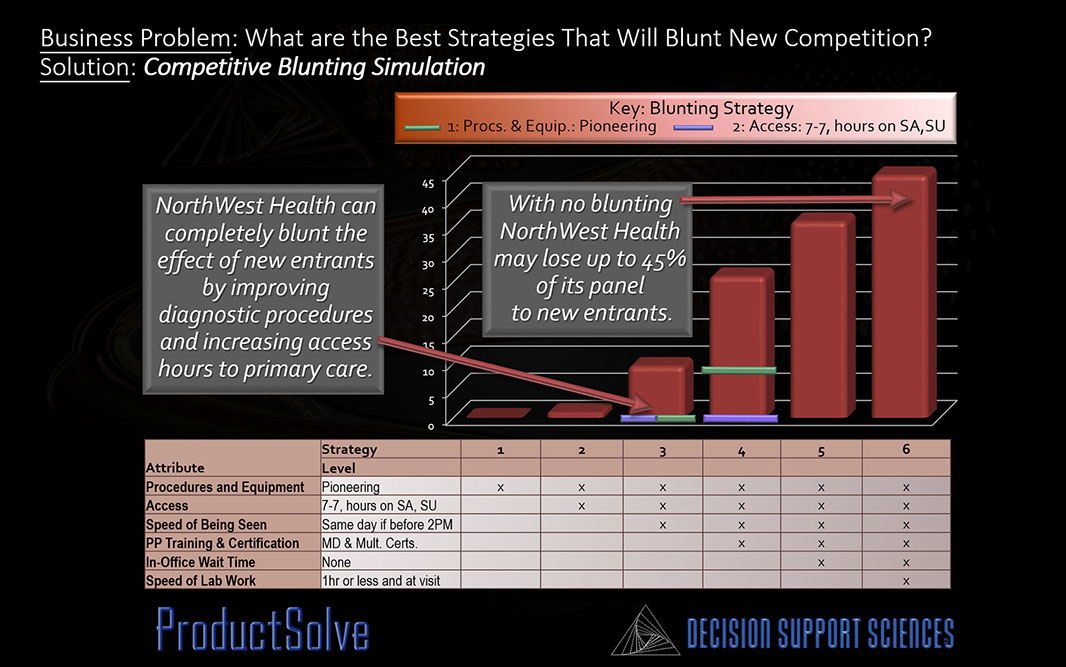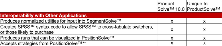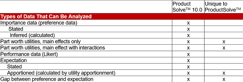 ProductSolve™ makes it possible to test product design strategies because it: 1) uses a specialized survey design that obtains seven key categories of data 2) calculates from that survey ultra accurate importance scores (utilities) for each respondent (see benefit three) 3) obtains key behavioral thresholds that determine how much summed preference are required to get each individual respondent "off the dime" 4) leverages an advanced analysis system that finds all significant differences in importance, performance and expectation 5) employs goal solving simulators that map to real-world outcomes (RWO's).