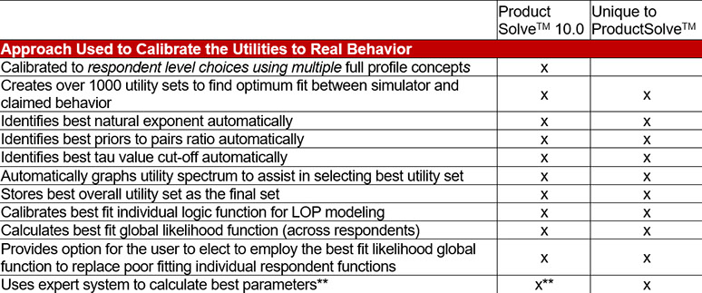 The correct theory is necessary, of course, but in the final analysis commercial decision support platforms must predict real world outcomes (RWO's.) ProductSolve™ leads the industry in predicting real world outcomes. This reason? First, ProductSolve™ produces the most accurate respondent-level importance scores (utilities). Second, we use a proprietary approach to finding behavioral thresholds in the survey. Third, we exhaustively calibrate to real-world outcomes using both internal and external calibration techniques.