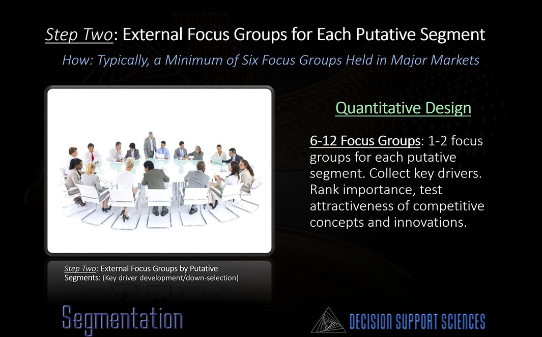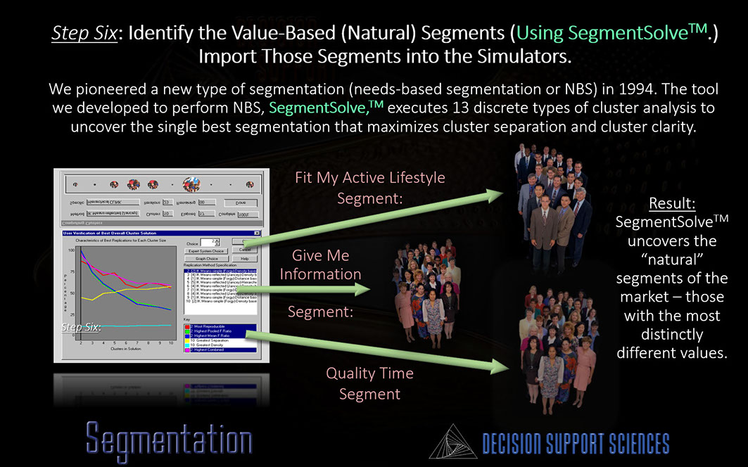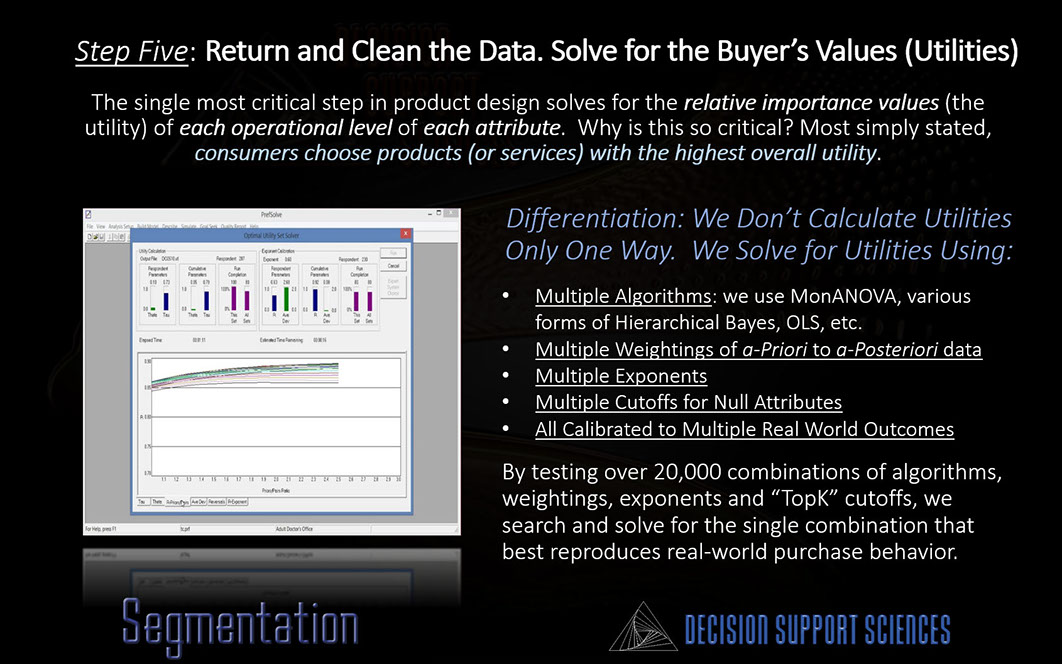 Research has now made it clear that simply asking customers what they like does NOT cut it. In contrast, our segmentation protocol requires the consumer to make the same TRADE-OFFS in survey that they make in real life. In this way consumers reveal their TRUE values. Next, of course, one must accurately SOLVE for those values. We pioneered our advanced utility calculation approach 20 years ago...and it still leads the industry in accuracy.