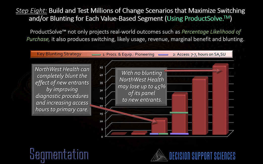 Two of the most powerful real-world outcomes built into ProductSolve™ are switching and blunting. Switching simulation identifies the product configurations that will maximize switching to your product or brand. Blunting, in contrast, identifies how the strategist can protect any product from competitive attrition. By importing the value-based segments developed by SegmentSolve™ into ProductSolve™ these outcomes can be extended to every relevant segment in the market..