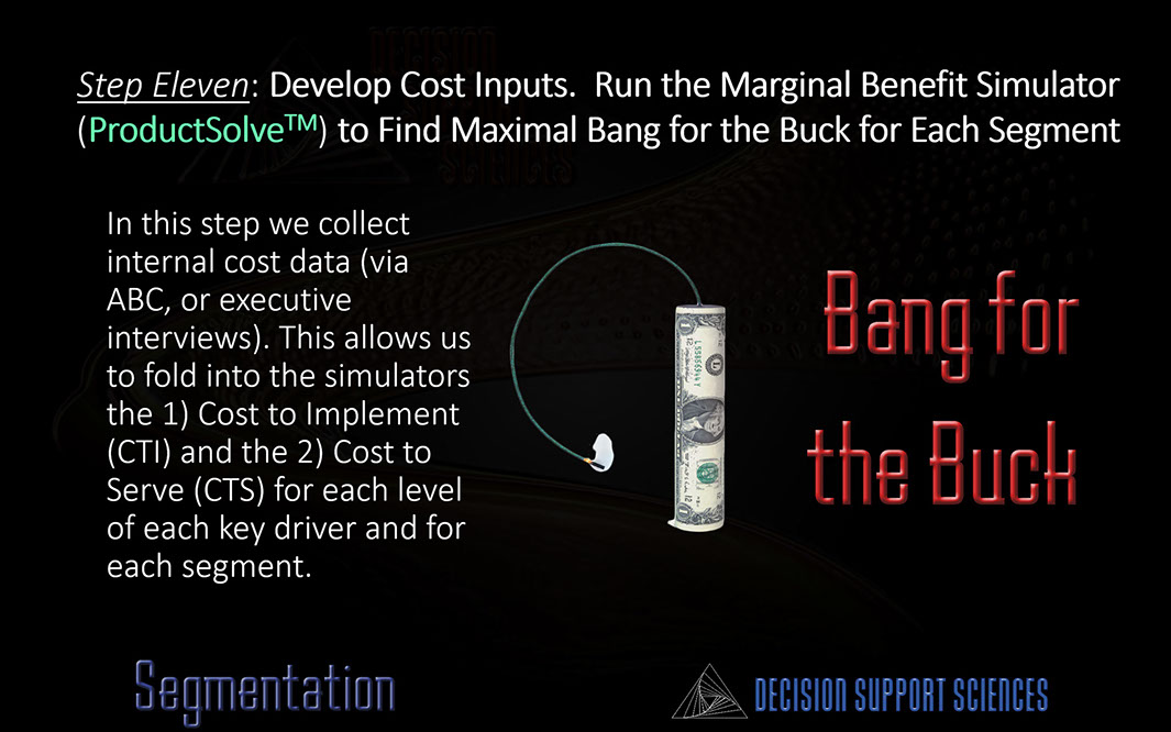 One of most powerful capabilities build into our Product Design protocol is the ability to perform Marginal Benefit (MB) Modeling. The MB model combines a real world outcome model (e.g. new customer capture, likelihood of purchase, switching, retention, etc) with two types of cost data, cost to implement (CTI) and cost to serve (CTS) data. By using CTI and CTS, the Marginal Benefit Model finds strategies that maximize real world outcomes at the lowest cost. When value-based segments are imported into the MB model, we can uncover the best "bang for the buck" for each segment.