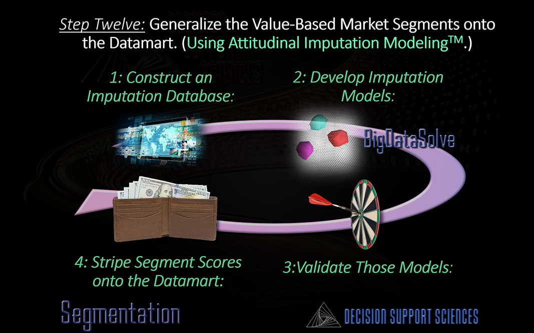 The strategic capabilities of our segmentation practice are competitively unparalleled (maximizing purchase, maximizing switching, and maximizing competitive blunting for each segment.) But there is still something missing....tactics. Since the central decisioning platform for tactical market deployment and sales capture is the datamart (or cloud server) how do we get the power of value-based segmentation onto the datamart? The answer is our datamart enhancement vertical, and its Attitudinal Imputation Modeling (AIM) protocol. AIM uses multivariate imputation to generalize the segments developed from the survey segments onto every record in the datamart.
