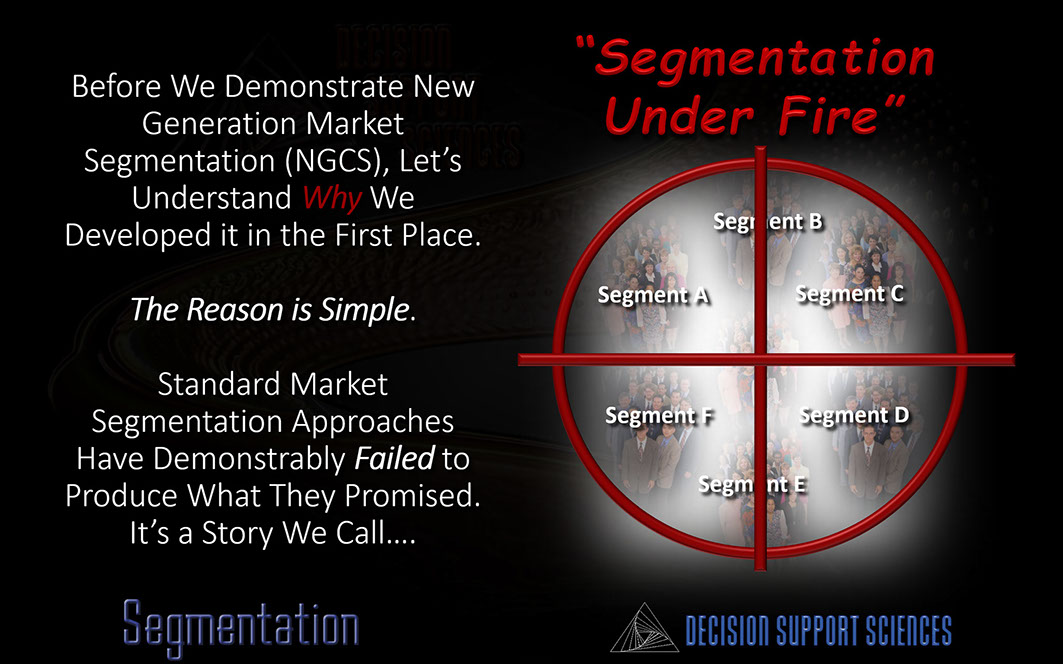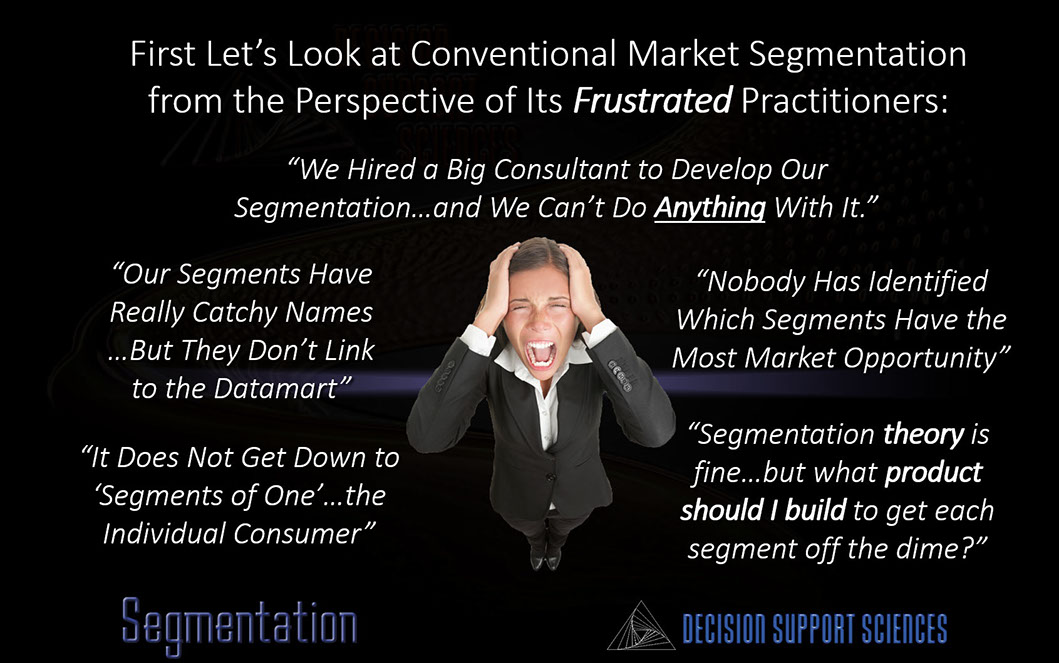 There is no pretty way to say it. Market Segmentation initiatives demonstrably fail most of the time. The problem? Conventional segmentation: 1) tends to be strategic and not tactical 2) doesn't provide specific product strategies that increase profit 3) doesn't tell us what specific products and services we need to build for each customer to produce real-world outcomes (sales, retention, profit.) 4) doesn't reside on the data mart...where tactics get deployed.