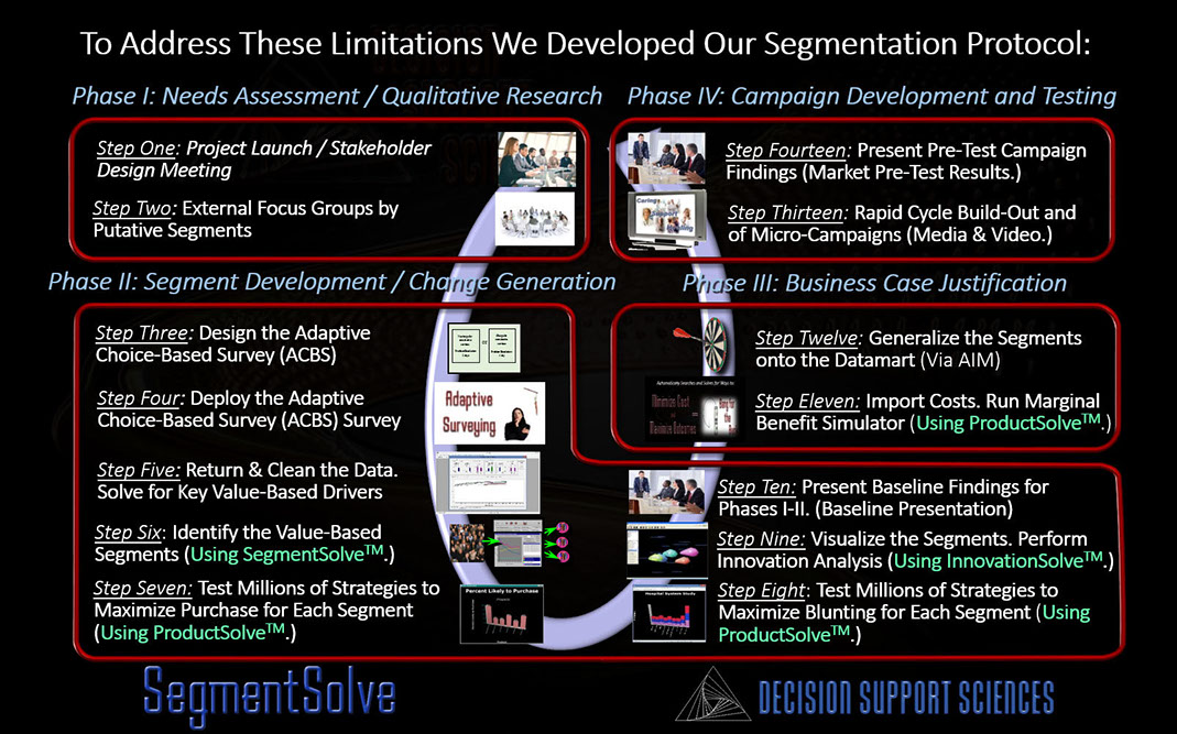 Segmentation uncovers the combinations of key drivers that are most attractive to consumers. The problem? Conventional "one-size-fits-all" segmentation tends to produce sub-optimal segments. To develop the most actionable segments requires a true segmentation decision support tool, one that: 1) executes multi-algorithmic clustering 2) identifies best solutions using expert systems 3) makes recommendations and 4) allows the user to redefine the parameters that define "best." All these features (and more) are built into our advanced segmentation decision support software, SegmentSolve.™